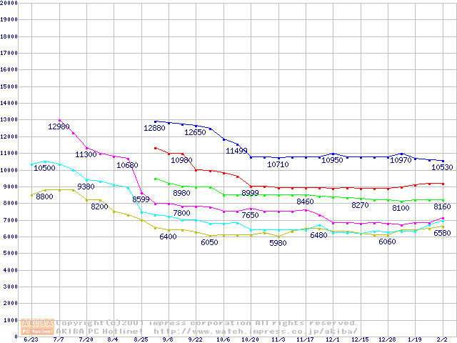 | [↑前グラフ]: | Socket 370 (FC-PGA2,FSB 100MHz,L2 256KB)の最安値推移 |