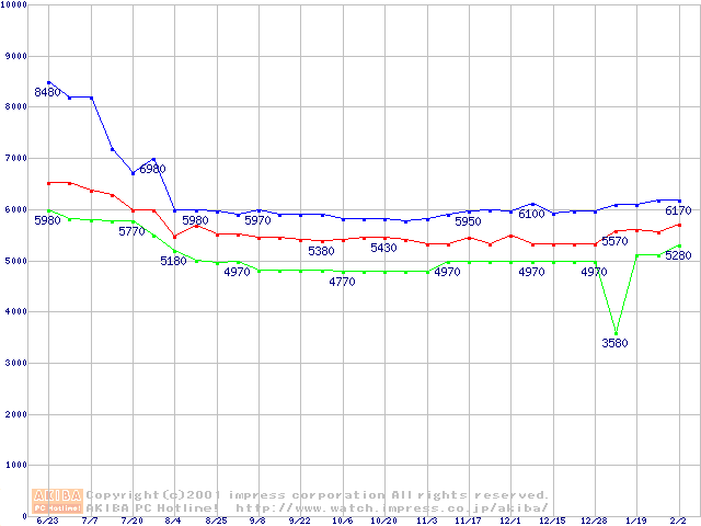 | [↑前グラフ]: | Socket 370 (FC-PGA,FSB 100MHz,L2 128KB)の最安値推移 |