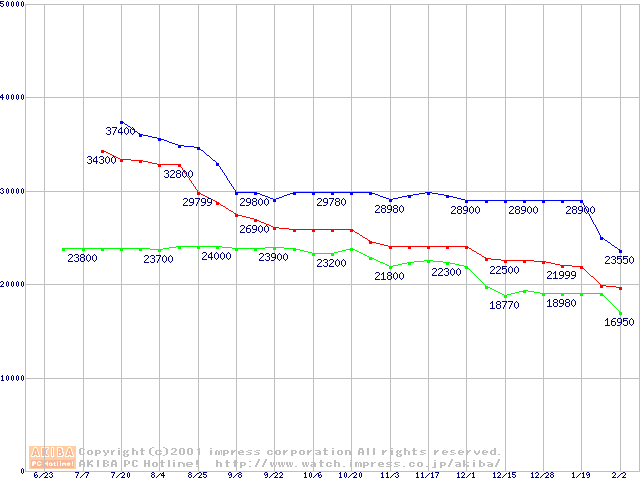 | [↑前グラフ]: | Socket 370 (FC-PGA2,FSB 133MHz,L2 512KB)の最安値推移 |