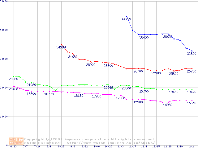 | [↓次グラフ]: | WD Caviar (7200rpm,UltraATA/100,20GB/Platter)の最安値推移 |