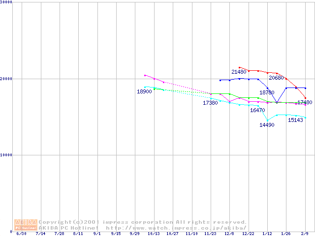| [↑前グラフ]: | 2.5インチHDD 20GB~30GB未満(9.5mm厚)の最安値推移 |
