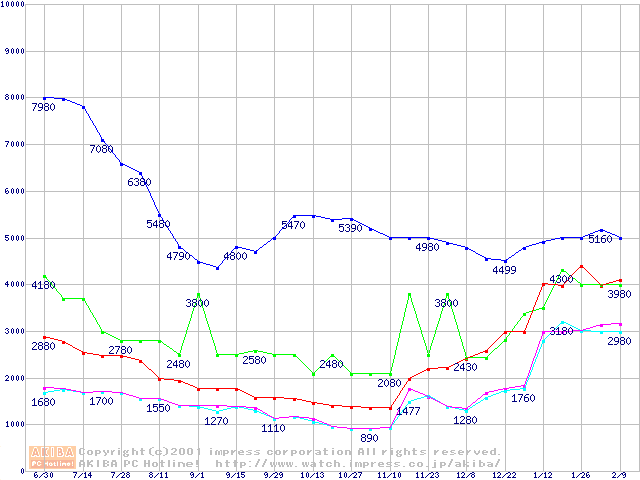メモリ主要製品の最安値推移