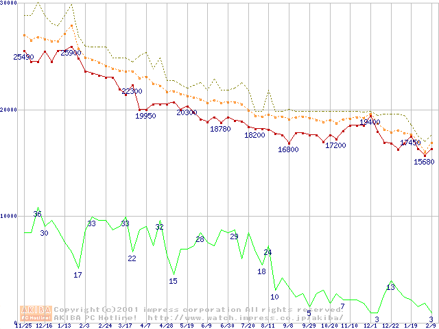 Socket 370 (FC-PGA,FSB 100MHz,L2 256KB)の最安値推移