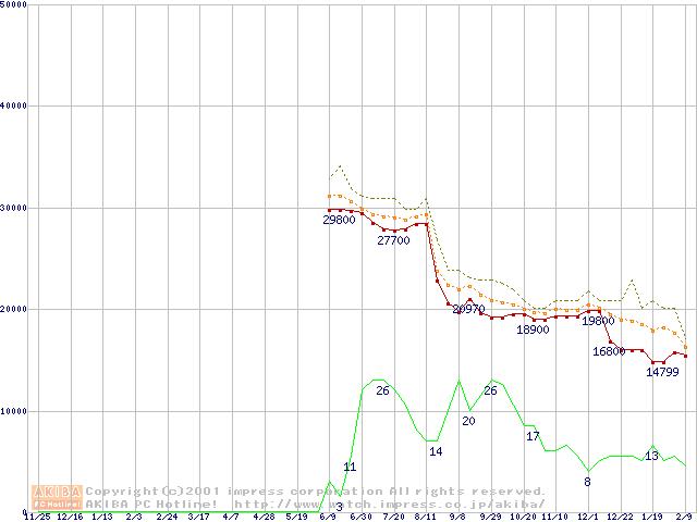 Socket A (Palomino,PGA,FSB 266MHz,L2 256KB)の最安値推移