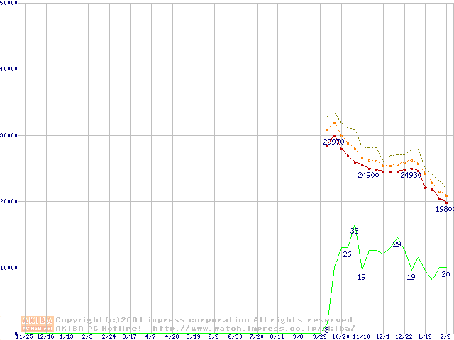 Socket A (Palomino,OPGA,FSB 266MHz,L2 256KB)の最安値推移