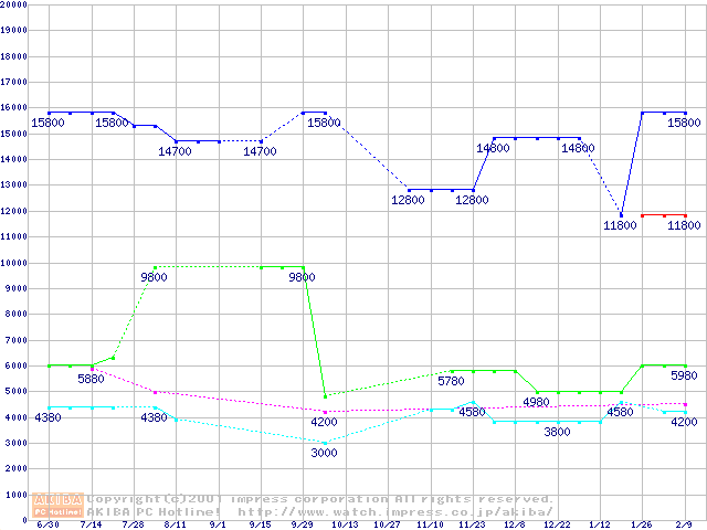 | [↑前グラフ]: | Socket A (Spitfire,PGA,FSB 200MHz,L2 64KB,1.4V)の最安値推移 |