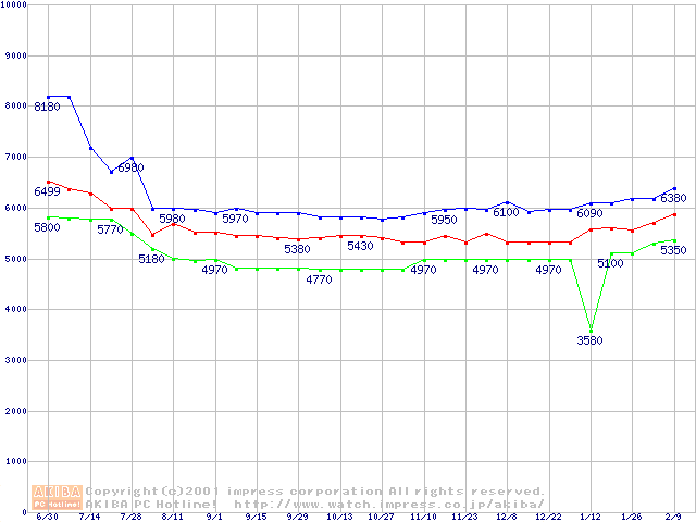 | [↑前グラフ]: | Socket 370 (FC-PGA,FSB 100MHz,L2 128KB)の最安値推移 |