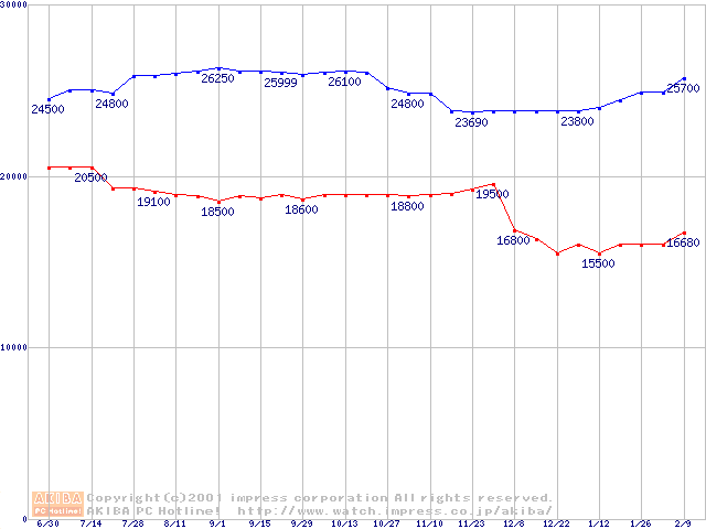 | [↑前グラフ]: | Slot 1 (SECC2,FSB 133MHz,L2 256KB)の最安値推移 |