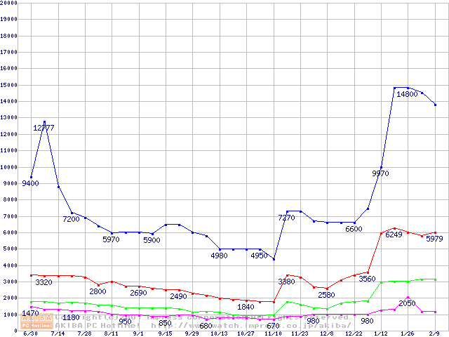 | [↓次グラフ]: | PC100 SDRAM DIMM CasLatency=2 ECC対応の最安値推移 |