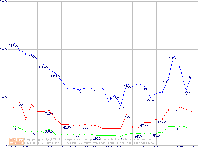 | [↑前グラフ]: | PC100 SDRAM DIMM CasLatency=2の最安値推移 |
