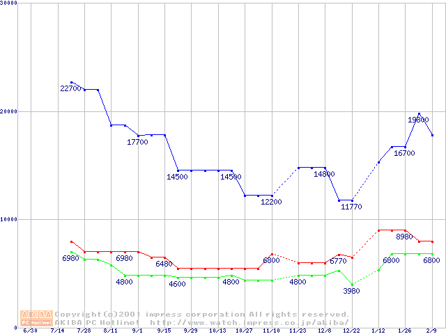 | [↑前グラフ]: | PC100 SDRAM DIMM CasLatency=2 ECC対応の最安値推移 |