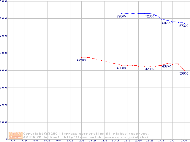 | 2.5インチHDD主要製品(最安値3万円以上)の最安値推移 |