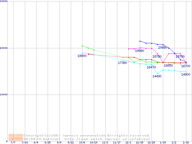 | [↑前グラフ]: | 2.5インチHDD 20GB~30GB未満(9.5mm厚)の最安値推移 |