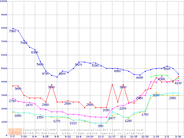 メモリ主要製品(最安値5千円~1万円未満)の最安値推移