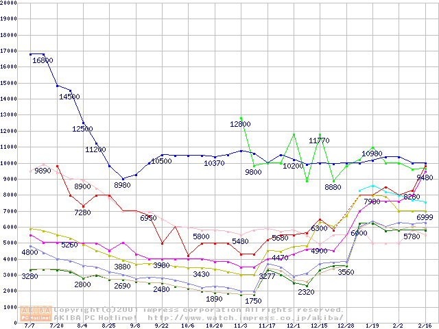 メモリ主要製品(最安値1万円以上)の最安値推移