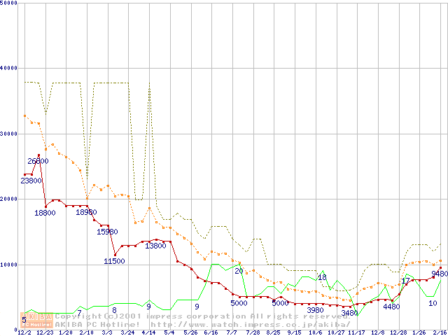 PC133 SDRAM DIMM CasLatency=3 ECC対応の最安値推移