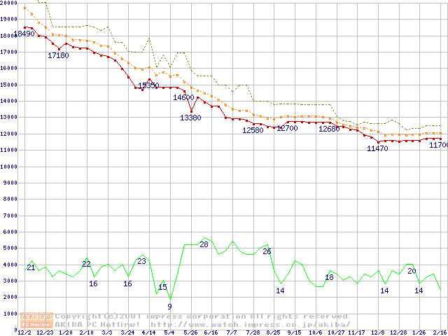 WD Caviar (7200rpm,UltraATA/100,20GB/Platter)の最安値推移