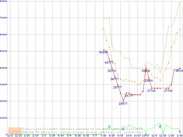 PC133 SDRAM DIMM CasLatency=3 ECC対応 Registeredタイプの最安値推移