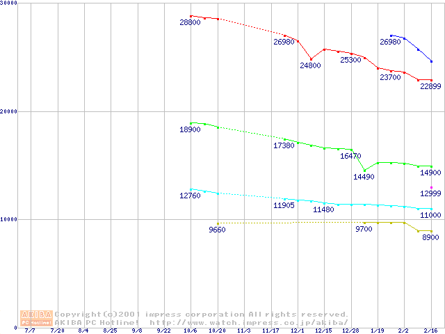 | [↑前グラフ]: | Travelstar 20GN (9.5mm,4200rpm,UltraATA/66,2MB/512KB/256KB)の最安値推移 |