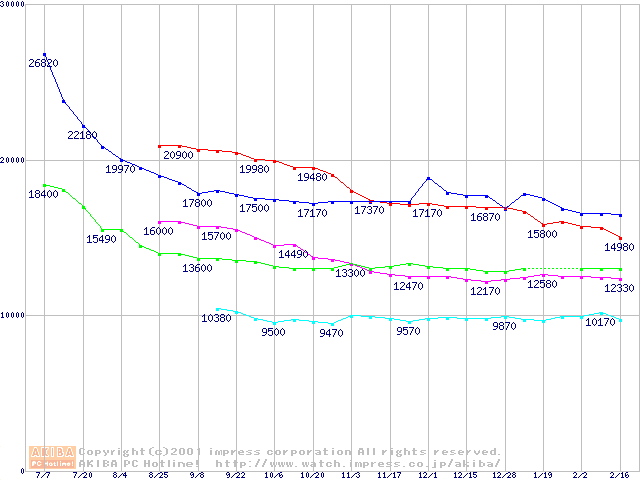 | [↓次グラフ]: | DiamondMax 536DX (5400rpm,UltraATA/100,33.3GB/Platter)の最安値推移 |