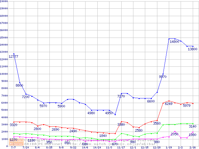 | [↓次グラフ]: | PC100 SDRAM DIMM CasLatency=2 ECC対応の最安値推移 |