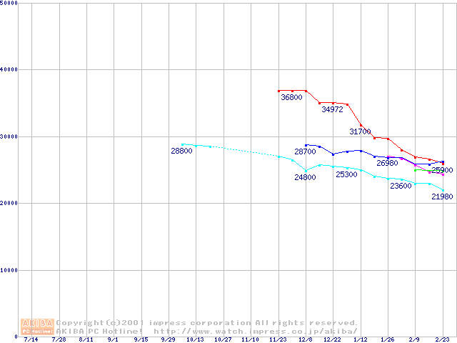 | [↓次グラフ]: | 2.5インチHDD主要製品(最安値3万円以上)の最安値推移 |