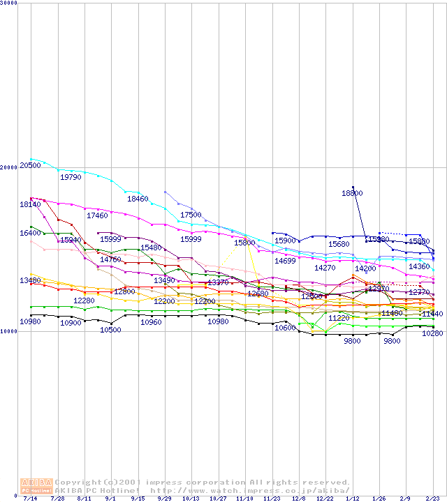 HDD主要製品(最安値1万5千円~2万円未満)の最安値推移
