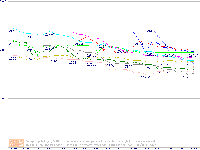 HDD主要製品(最安値1万5千円~2万円未満)の最安値推移