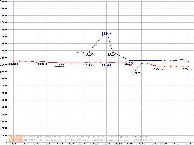| [↑前グラフ]: | HDD 20GB~30GB未満(7200rpmクラス)の最安値推移 |