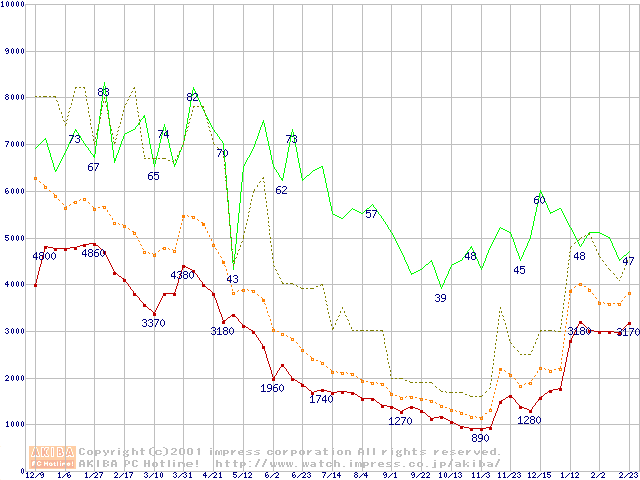 PC133 SDRAM DIMM CasLatency=3の最安値推移