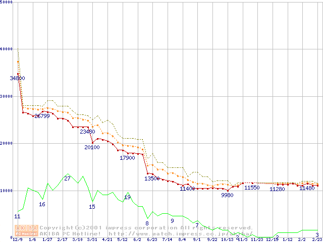 Socket A (Thunderbird,PGA,FSB 200MHz,L2 256KB)の最安値推移