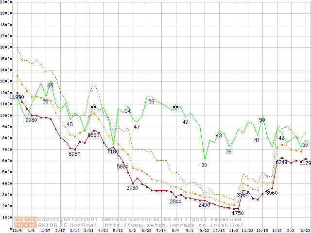 PC100 SDRAM DIMM CasLatency=2の最安値推移
