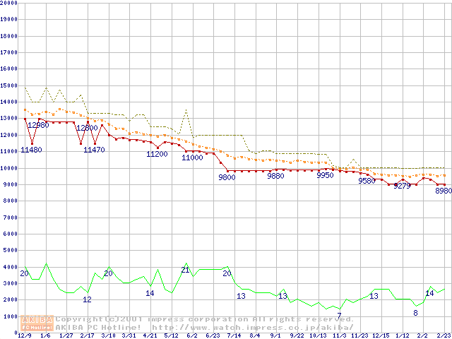 WD Caviar (7200rpm,UltraATA/100,20GB/Platter)の最安値推移