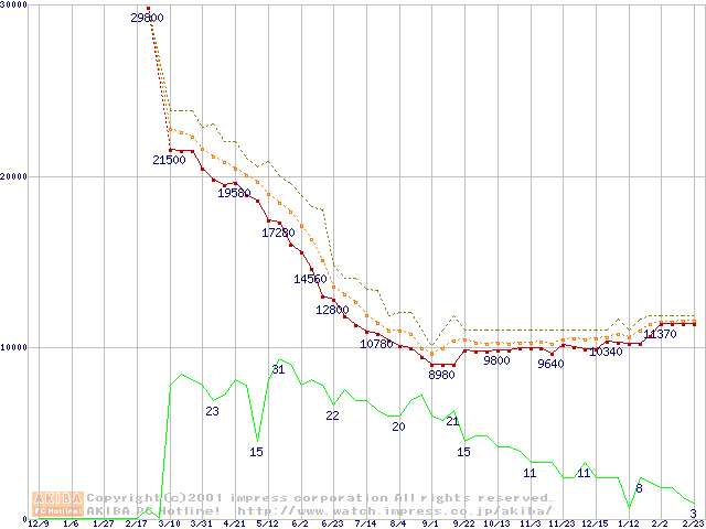 Socket A (Thunderbird,PGA,FSB 266MHz,L2 256KB)の最安値推移