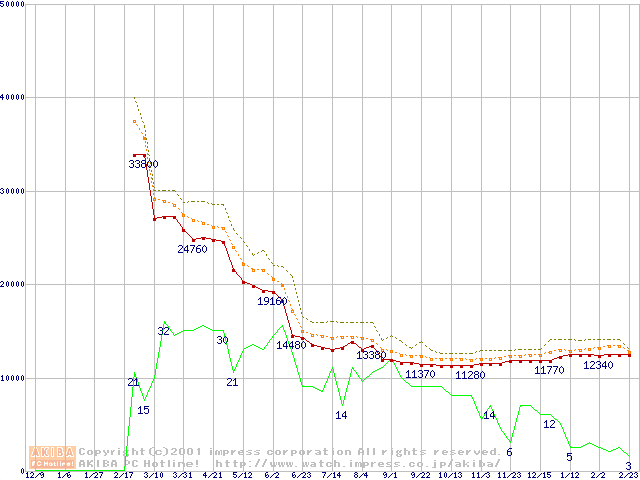 Socket A (Thunderbird,PGA,FSB 266MHz,L2 256KB)の最安値推移