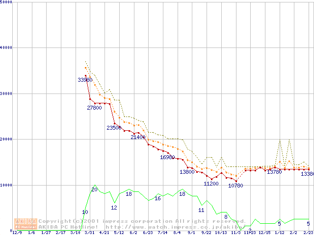 Socket A (Thunderbird,PGA,FSB 200MHz,L2 256KB)の最安値推移