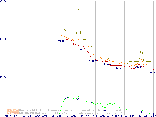 DiamondMax 536DX (5400rpm,UltraATA/100,33.3GB/Platter)の最安値推移