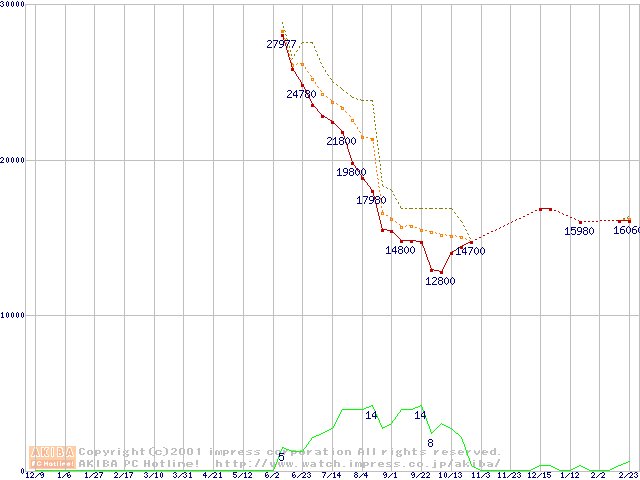 Socket A (Thunderbird,PGA,FSB 200MHz,L2 256KB)の最安値推移