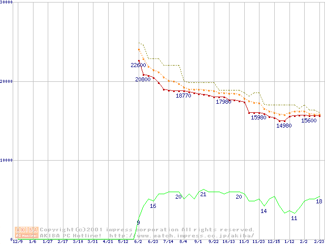 HDD主要製品(最安値1万5千円~2万円未満)の最安値推移