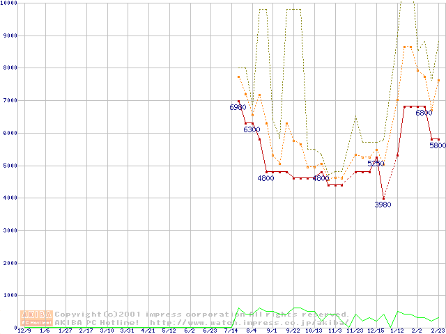 PC100 SDRAM DIMM CasLatency=2 ECC対応 Registeredタイプの最安値推移
