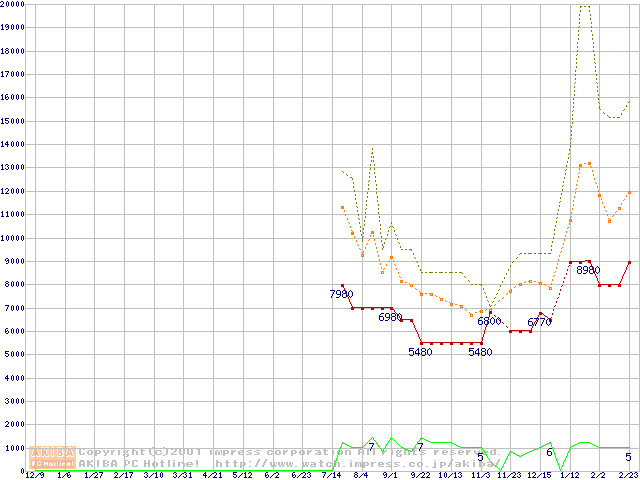 PC100 SDRAM DIMM CasLatency=2 ECC対応 Registeredタイプの最安値推移
