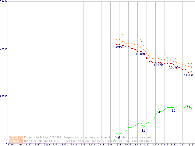 HDD主要製品(最安値1万5千円~2万円未満)の最安値推移