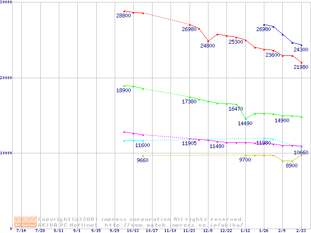 | [↑前グラフ]: | Travelstar 20GN (9.5mm,4200rpm,UltraATA/66,2MB/512KB/256KB)の最安値推移 |