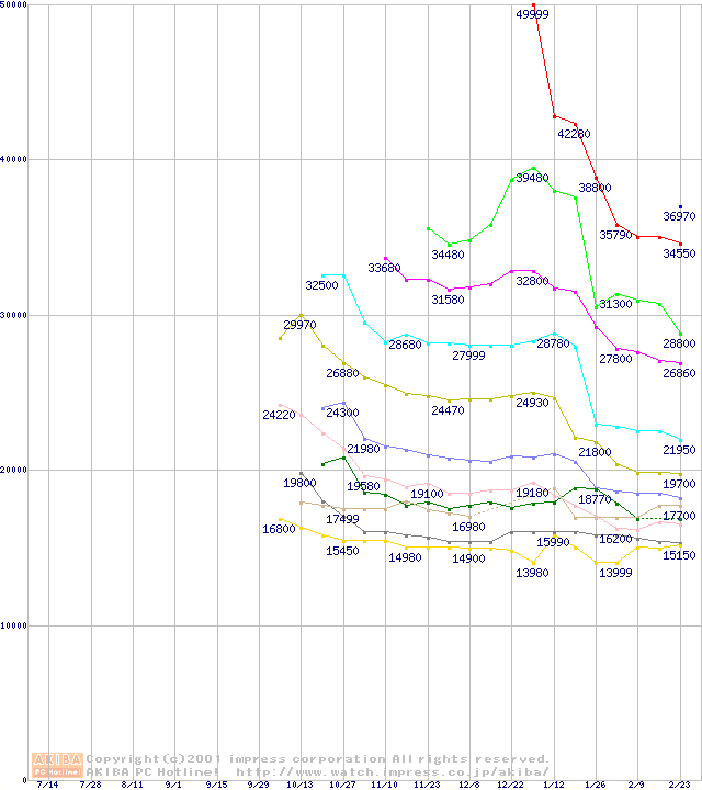 Socket A (Palomino,OPGA,FSB 266MHz,L2 256KB)の最安値推移