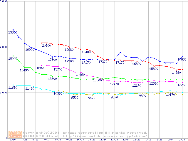 | [↓次グラフ]: | DiamondMax 536DX (5400rpm,UltraATA/100,33.3GB/Platter)の最安値推移 |