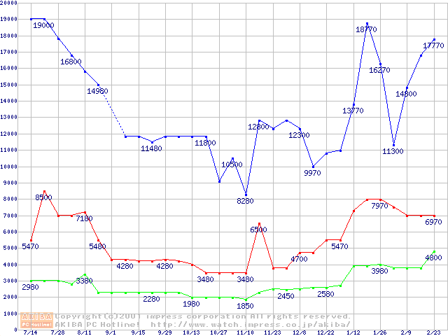 | [↑前グラフ]: | PC100 SDRAM DIMM CasLatency=2の最安値推移 |