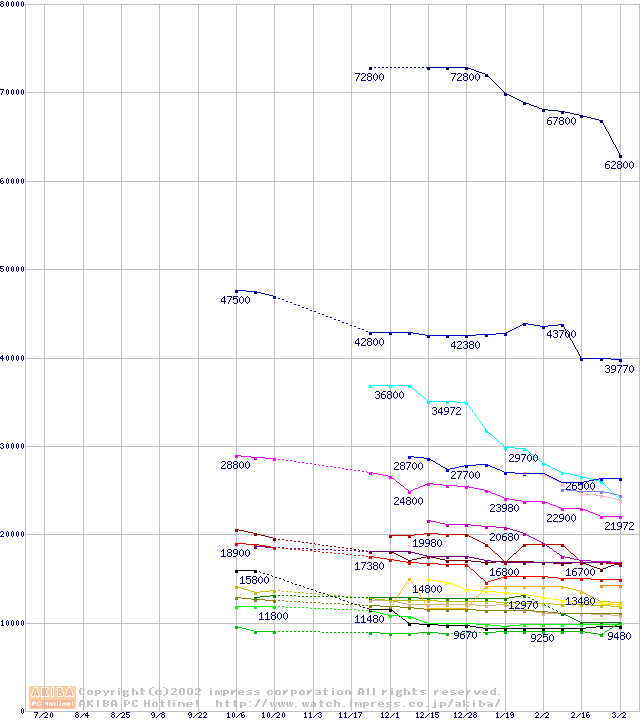 2.5インチHDD主要製品(最安値1万円未満)の最安値推移
