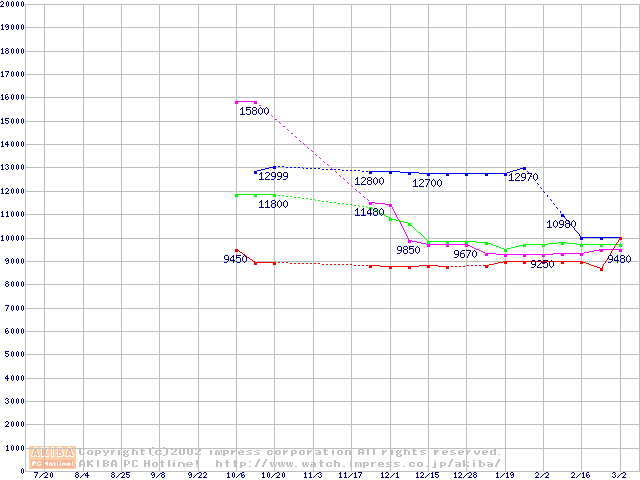 | [↓次グラフ]: | 2.5インチHDD主要製品(最安値1万円~1万5千円未満)の最安値推移 |