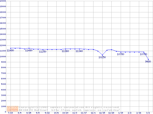 | [↑前グラフ]: | HDD 20GB~30GB未満(7200rpmクラス)の最安値推移 |