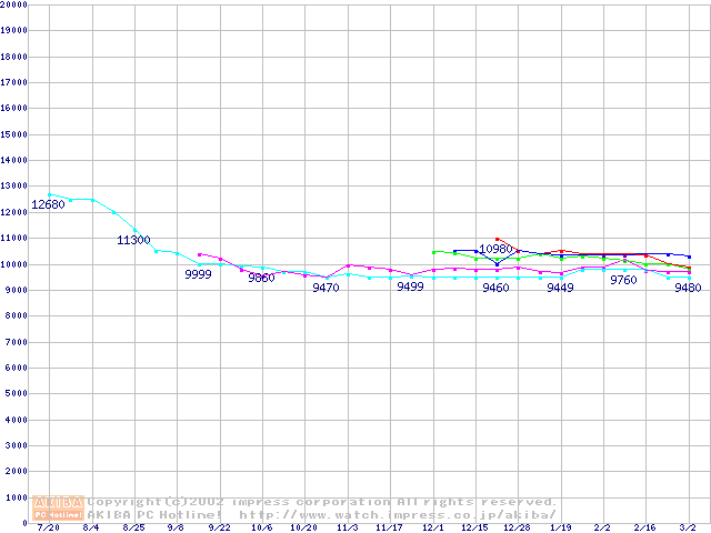 | [↑前グラフ]: | HDD 30GB~40GB未満(5400rpmクラス)の最安値推移 |
